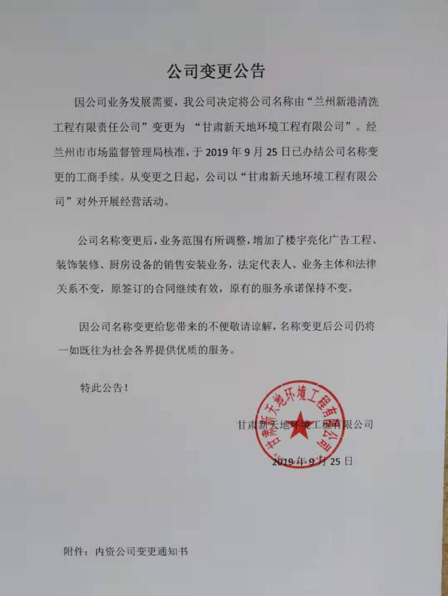 我公司更名為“甘肅新天地環境工程有限公司”,營業范圍增加了樓宇亮化廣告工程、裝飾裝修、廚房設備的銷售安裝等業務,敬請周知。